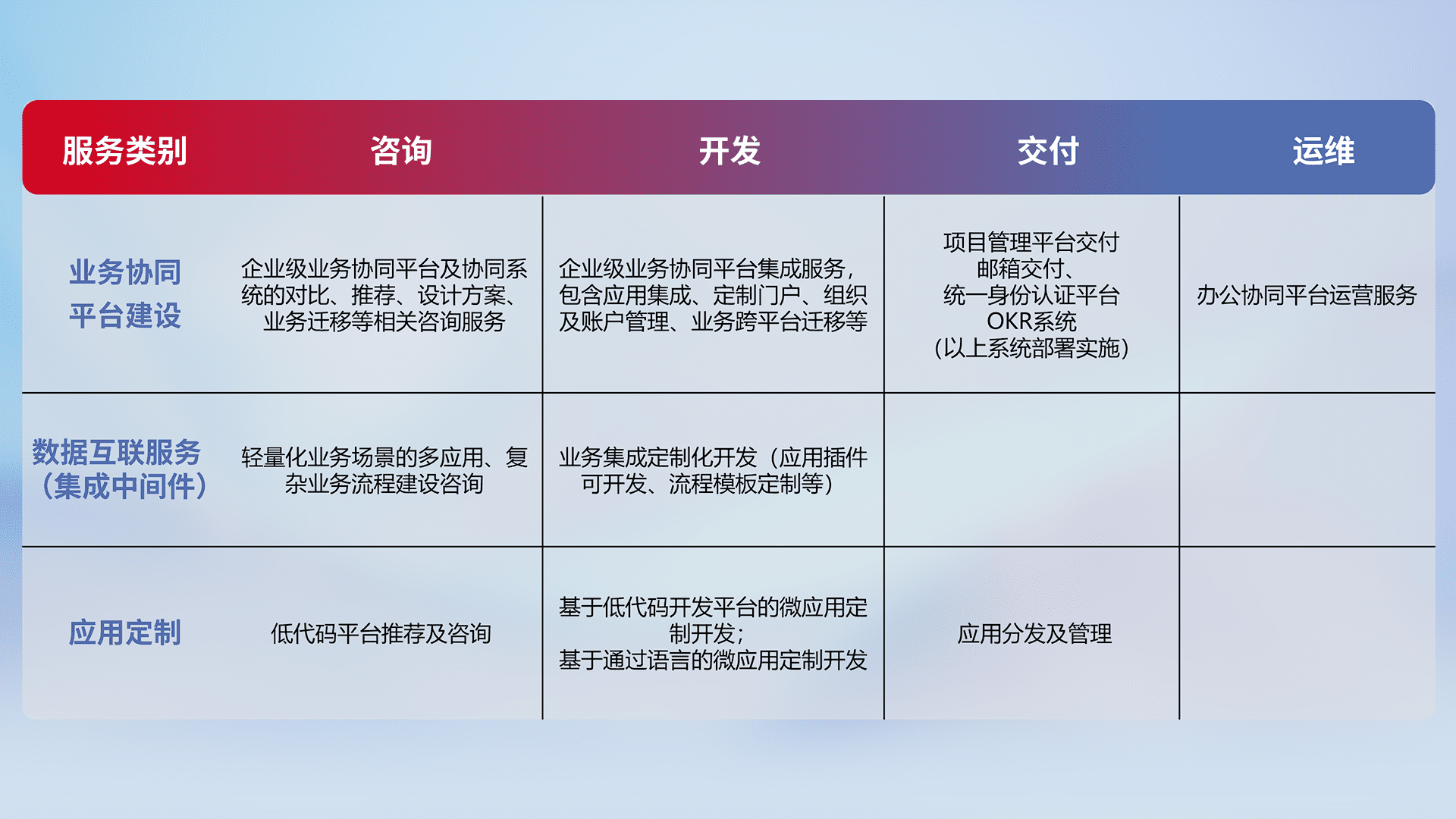 针对钉钉、、、、企微、、、、IDaas等平台级产品提供产品的规划、、、、方案、、、、交付、、、、定制化开发等服务,,实现如统一协同办公、、、智能客户服务、、、、混合会议管理、、智能数据查询、、、、等业务场景,,,,实现数字化转型。。。。